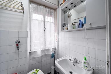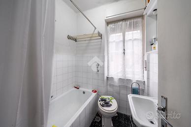 Nella porzione al primo piano troviamo un corridoio su cui è sviluppata la soluzione: è composta da una cucina e da un ripostiglio nella zona giorno e due camere matrimoniali nella zona notte oltre che un bagno finestrato con vasca.