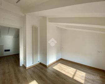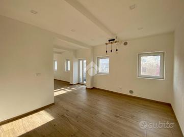 Sempre sul piano, un pratico antibagno separa la zona lavanderia (con caldaia e attacchi lavatrice) da un bagno finestrato dal design contemporaneo, completo di doccia walk-in, sanitari sospesi e raffinate finiture in gres effetto marmo. A servizio del bagno, un secondo terrazzo.