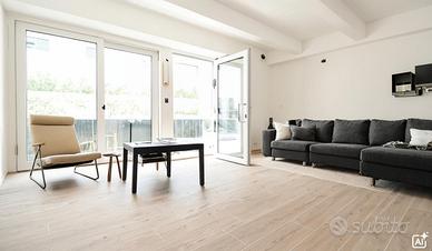 L'appartamento dispone di un soggiorno luminoso con angolo cottura, grazie alle grandi vetrate che lasciano entrare la luce naturale.