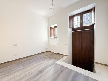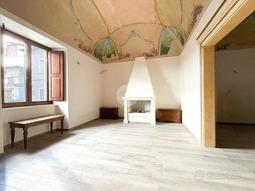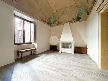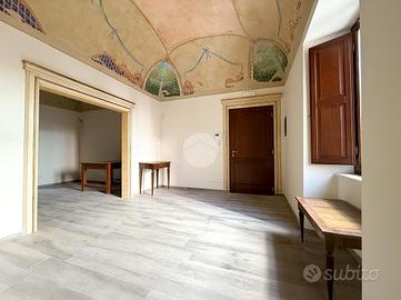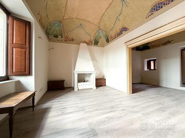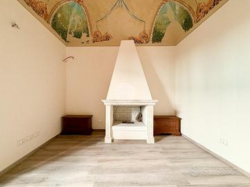 L'ingresso dell'appartamento apre su un ampio soggiorno impreziosito da una splendida volta affrescata e da un camino che dona carattere e calore all'ambiente. La cucina, abitabile, presenta anch'essa una volta affrescata, rendendo lo spazio estremamente ricercato e perfetto per chi ama vivere la casa con stile.