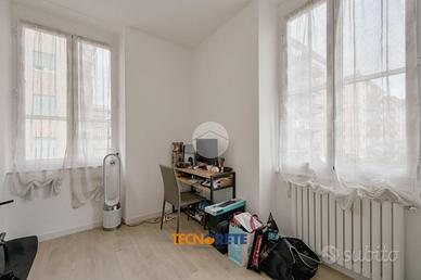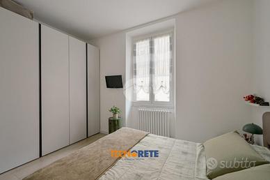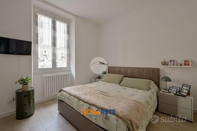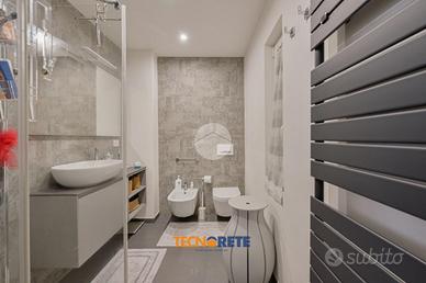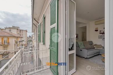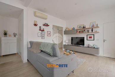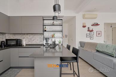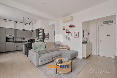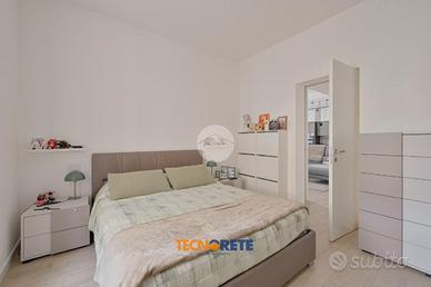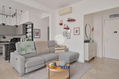 Attraverso porticina blindata si accede all'ampio soggiorno con cucina open space dotato di balcone. La proprietà comprende due camere da letto, una matrimoniale e una cameretta, un bagno cieco con box doccia e un comodo ripostiglio. L'appartamento è munito anche di aria condizionata.