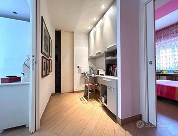 La zona notte comprende tre camere da letto, due bagni elegantemente rifiniti in mosaico; uno con vasca, l'altro con doccia, e un angolo studio ideale per il lavoro da remoto. Non mancano un pratico ripostiglio completo di zona lavanderia.
