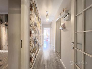 Varcando la porta blindata ci troviamo nell'ingresso ed attraverso una porta vetrata ad arco entriamo nel soggiorno luminoso in quanto esposto a sud dove subito notiamo la presenza di un elegante camino. Attraverso una porta finestra è possibile uscire sul balcone principale di 16 mq. In più oltre ad un tavolo per sei persone in soggiorno è presente una zona tv dove trova spazio un divano con penisola ed una parete attrezzata.