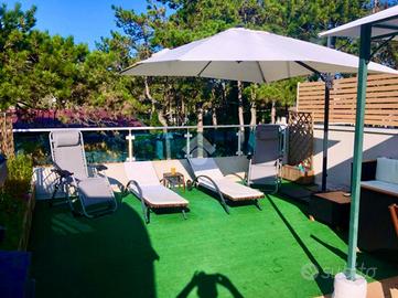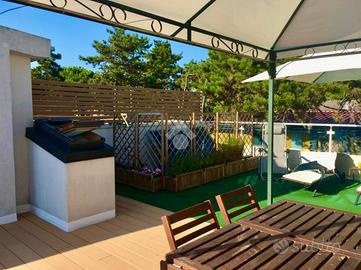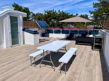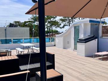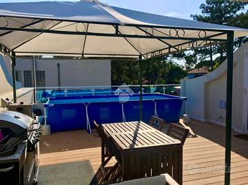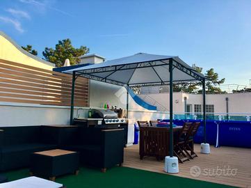 Dalla zona giorno passiamo alla terrazza all'ultimo piano tramite la scala interna, dove abbiamo la doccia, un lavabo, il locale caldaia, un pannello solare ed un salottino da esterno e si ha, inoltre, la possibilità di installare una piscina.