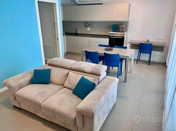 Dopo aver oltrepassato il cancello e percorso un tratto del marciapiede di ingresso del residence, ci troviamo nel primo terrazzino e, di fronte, al portoncino d'ingresso dell'immobile, dal quale si accede al locale pranzo soggiorno composto da cucina, con piano cottura a induzione, lavabo, pensili da cucina e, a completare, il divano letto ed il tavolo per sei persone.