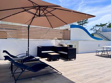 Dalla zona giorno passiamo alla terrazza all'ultimo piano tramite la scala interna, dove abbiamo la doccia, un lavabo, il locale caldaia, un pannello solare ed un salottino da esterno e si ha, inoltre, la possibilità di installare una piscina.