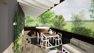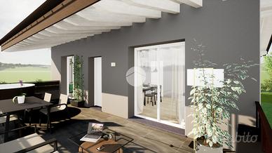 Al piano primo si sviluppa un quadrilcoale composto da soggiorno con cucina open space, tre camere da letto e doppi servizi finestrati. All'esterno porzione ridotta di giardino e terrazza.