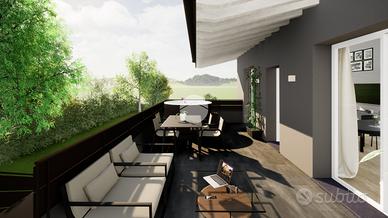 Al piano primo si sviluppa un quadrilcoale composto da soggiorno con cucina open space, tre camere da letto e doppi servizi finestrati. All'esterno porzione ridotta di giardino e terrazza.
