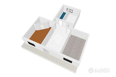 L'ingresso si apre su un'ampia zona giorno che unisce quasi in un unico ambiente soggiorno e cucina, resa accogliente dalla pavimentazione chiara e uniforme, capace di dare continuità e luminosità all'intero spazio.