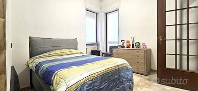 Entrando in casa si accede a un vano ingresso. A sinistra troviamo una cameretta con finestra, una porta-finestra che porta al balcone in comune con il soggiorno-cucina, e una piccola cabina armadio. Frontalmente si entra nel soggiorno/cucina, illuminato da due porte-finestra. La porta-finestra di sinistra porta sul balcone abitabile. La porta-finestra frontale è alla francese. Dall'ingresso, svoltando a destra, sulla sinistra si ha il primo bagno, con doccia, e l'accesso alla camera matrimoniale; a destra la cameretta con balcone; frontalmente un bagno con vasca. Le finiture includono porta di ingresso blindata, infissi in legno con vetro singolo, climatizzazione in tutte le stanze, zanzariere. I bagni sono completamente rifatti. Ai pavimenti si ha marmo nella zona giorno e in una delle camerette, parquet nella camera matrimoniale e nella seconda cameretta, ceramica nei bagni.