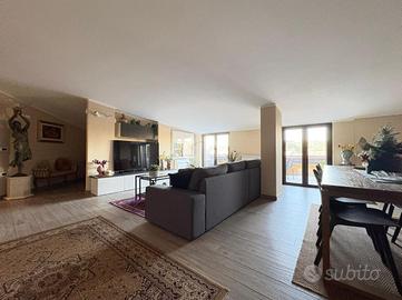 Ingresso su un ampio soggiorno con zona bassa sapientemente valorizzata, dove è stato creato un pratico e profondo ripostiglio. Dal living si accede a un terrazzo panoramico con vista mozzafiato, già arredato con: