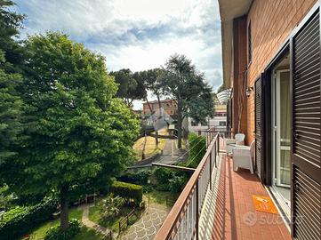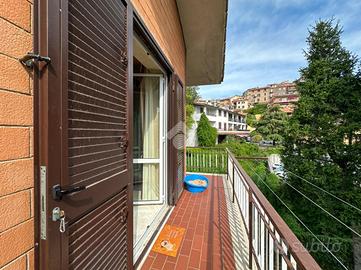 Un disimpegno conduce alla zona notte, dove troviamo una spaziosa camera matrimoniale con cappotto interno per una migliore coibentazione e accesso diretto al balcone angolare. Lo spazio esterno, affacciato sul verde, è arredato con poltrone e tavolino: perfetto per rilassarsi in tranquillità. La seconda parte del balcone ospita la caldaia, con possibilità di installare anche una lavatrice da esterno.