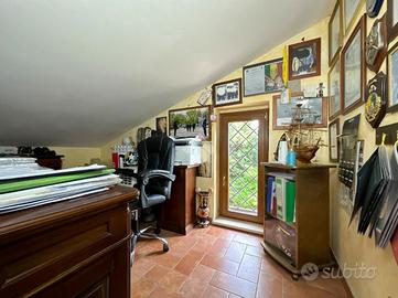 Dal soggiorno, tramite una scala interna, si accede al piano superiore, completamente rifinito e attualmente utilizzato come zona living/studio. Qui troviamo un ambiente multifunzione con divano letto e angolo lettura arricchito da un elegante biocamino, uno spazio dedicato allo studio, un secondo bagno finestrato con vasca e un comodo ripostiglio ricavato nella parte più bassa del sottotetto, con una superficie utile di circa 30 mq.