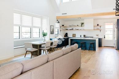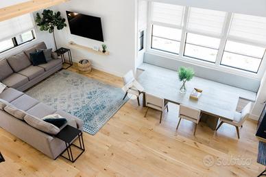 L'ingresso si apre su una zona living accogliente e spaziosa pensata per essere il cuore pulsante della casa da cui si accede alla cucina e alla loggia di circa 16 mq: Le ampie vetrate rendono gli ambienti luminosi e ariosi, amplificando la spazialità e giocando delicatamente con le sfumature dei materiali naturali.