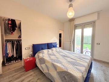 A completare la zona giorno, una cucina abitabile separata dal salotto, dotata di accesso diretto al resede tergale di 115 mq, in parte pavimentato e in parte con giardino.