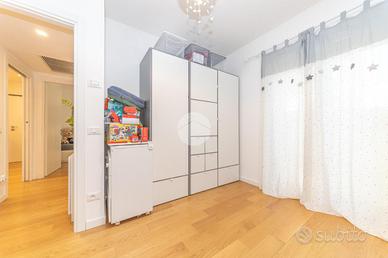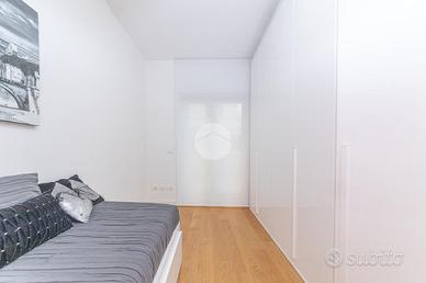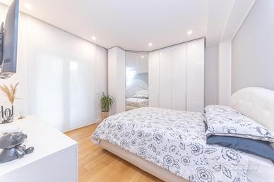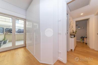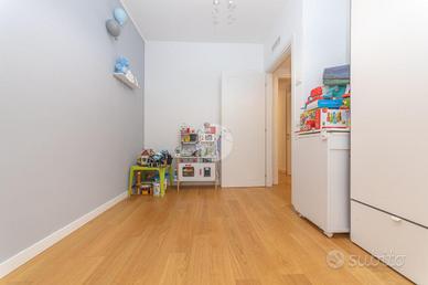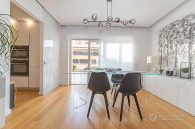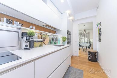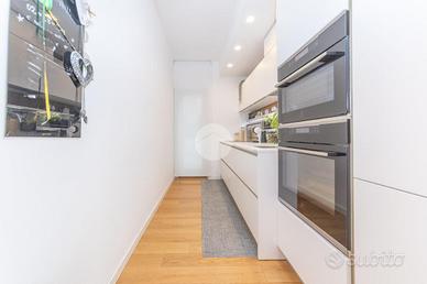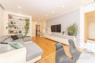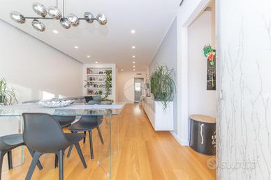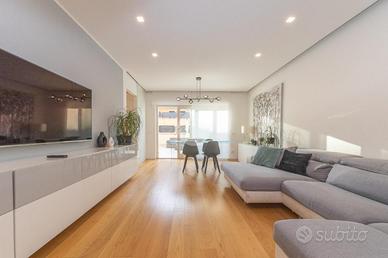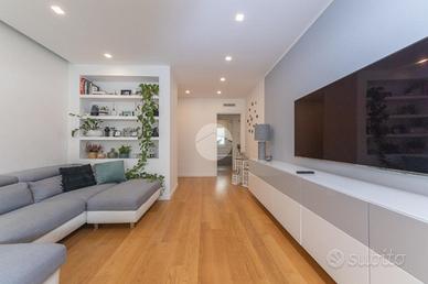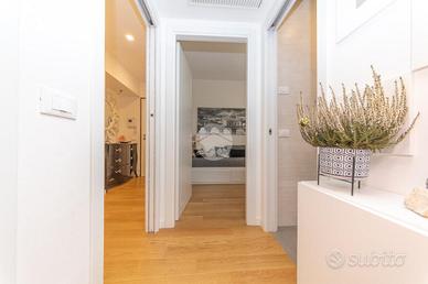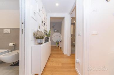L'ingresso si apre su un ampio e luminoso soggiorno dai toni moderni e raffinati, caratterizzato da un parquet rovere (Listone Giordano) presente in tutti gli ambienti, ad eccezione dei bagni, completamente rivestiti in gres porcellanato.