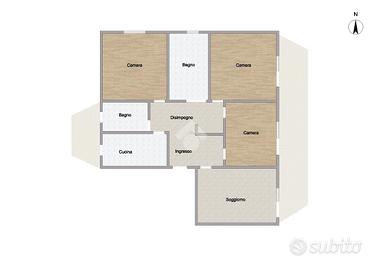 L'immobile, che si trova in un edificio in cemento armato dotato di ascensore, è composto da un ingresso in disimpegno, cucina abitabile, doppi servizi, salone e tre camere.