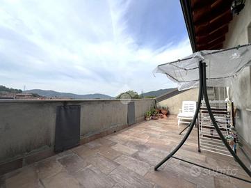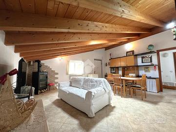 La cucina, semi-separata tramite un muretto all'americana, e abitabile, è fornita di accesso al terrazzo di 20 mq circa che offre una gradevole vista sul circondario e sulle montagne.