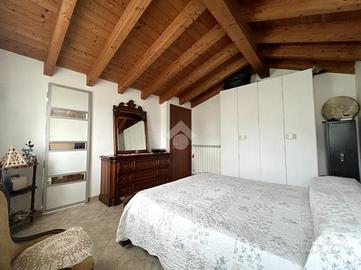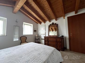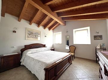 Le travi a vista in tutte le stanze e gli inseriti in pietra nella zona giorno conferiscono calore, carattere e autenticità agli ambienti.