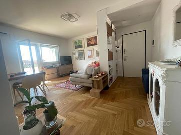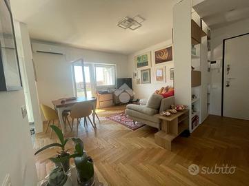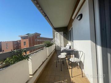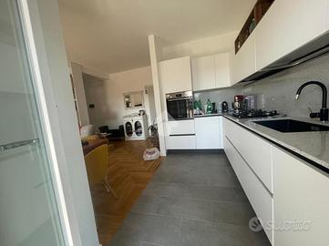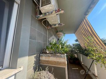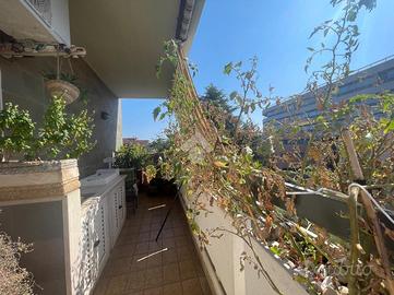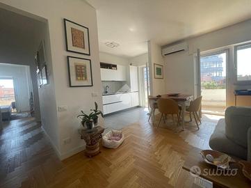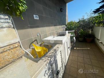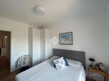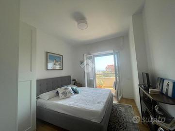 VIA CALCARE In palazzina del 2011, situata in un contesto tranquillo e silenzioso, a soli 800 metri dal centro e dal mare, proponiamo in vendita un luminoso appartamento completamente ristrutturato, posto al 3° piano servito da ascensore e caratterizzato da un'ottima esposizione sud-est. Varcando la soglia d'ingresso si accede all'ampio soggiorno con elegante cucina a vista, pratica e finemente attrezzata, dal quale, tramite porta finestra, si accede ad un balcone abitabile ideale per pranzi e momenti di relax all'aperto. Qui troviamo una parete cucina esterna attrezzata, impreziosita da un originale orto urbano in vaso a ridosso dei fornelli con sistema di irrigazione, due ripostigli di cui uno vano caldaia con spazio multiuso nella parte inferiore, una soluzione funzionale e scenografica che rende unico lo spazio esterno. Un disimpegno divide in maniera funzionale la zona giorno dalla zona notte, composta da una camera matrimoniale e una cameretta: entrambe le camere hanno accesso diretto al secondo balcone con splendida vista mare. Completano la zona notte due bagni (uno finestrato con vasca, l'altro con aeratore e box doccia) e un comodo ripostiglio/lavanderia. L'appartamento si distingue per le rifiniture di pregio, come il parquet che dona calore e raffinatezza agli ambienti, infissi in doppio vetro, zanzariere di ultima generazione e tapparelle elettriche, videocitofono, tende da sole su entrambi i balconi, riscaldamento a termosifoni e moderni condizionatori che garantiscono il massimo comfort in ogni stagione. La palazzina è inoltre dotata di pannelli fotovoltaici di ultima generazione, che forniscono corrente elettrica e energia a disposizione del condominio, riducendo i costi delle spese comuni (ascensore, garage e parti comuni). A completare la proprietà troviamo una cantina di 9 mq e un posto auto assegnato nel garage condominiale, che rendono questa soluzione ancora più pratica e funzionale. Possibilità di visionare l'immobile tutt