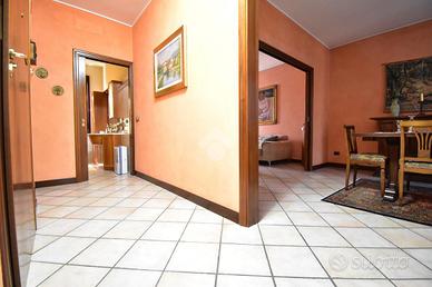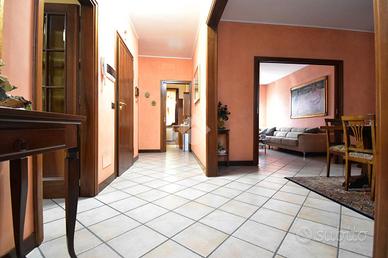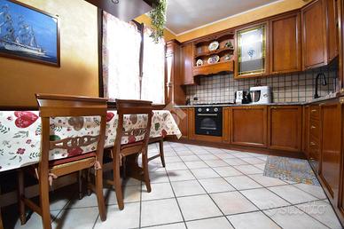 L'ingresso si apre su una spaziosa zona giorno dove la cucina abitabile, realizzata su misura, si integra perfettamente con il living, che unisce sala da pranzo e soggiorno grazie a una raffinata porta scorrevole decorata con vetri colorati che diffondono luce e creano un'atmosfera calda ed elegante.