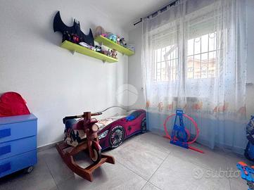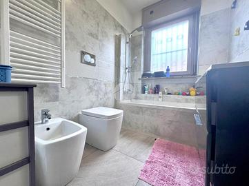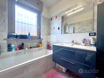 Dal disimpegno si accede alla zona notte, composta da una camera matrimoniale con accesso diretto al giardino, ampio e ben curato, dove poter creare un angolo verde o una zona relax. Completano la zona notte una cameretta e un bagno finestrato con vasca, ristrutturato pochi anni fa e mantenuto in perfette condizioni.