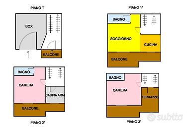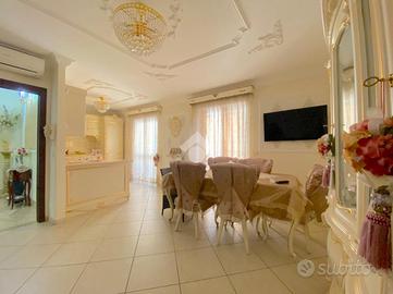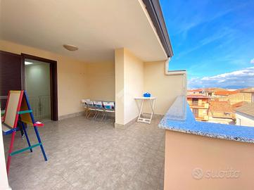 La soluzione è disposta su 3 livelli ed è composta dall'ingresso nel disimpegno, proseguendo per il vano scala si ha accesso alla zona giorno composta da un ampio soggiorno living con angolo cottura e un accessorio; proseguendo per il vano scala accediamo alla zona notte composta da una camera matrimoniale con cabina armadio e un bagno;proseguendo si ha accesso all'ultimo livello composto da una cameretta, un bagno e un ampio terrazzo a livello. Completa la soluzione un box auto doppio. L'immobile si presenta in buono stato. Visionabile tutti i giorni previo avviso telefonico allo