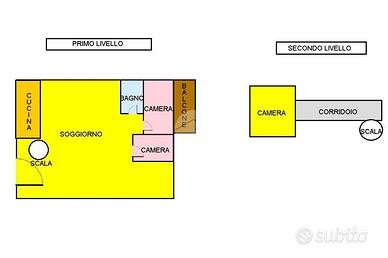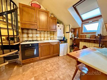 La soluzione è così disposta: entrando troviamo una zona giorno open-space con angolo cottura e camino, proseguendo una camera matrimoniale, una singola con affaccio su comodo balcone panoramico e un bagno con doccia. Salendo troviamo un ulteriore camera da letto singola.