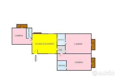 Esso si compone di ingresso su ampia cucina-soggiorno che disimpegna le tre camere da letto, ciascuna con bagno annesso.