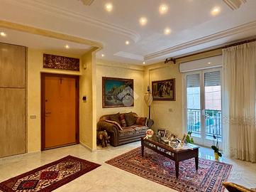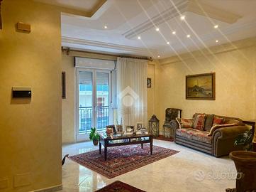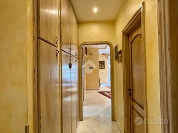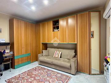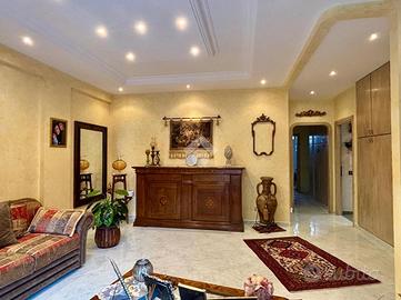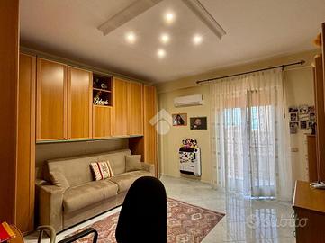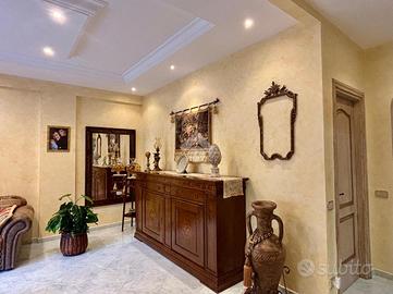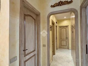 - Ingresso su ampio soggiorno con accesso diretto a un balcone, controsoffitto con illuminazione a faretti LED integrati e armadiatura a muro su misura con ante a tutta altezza ;