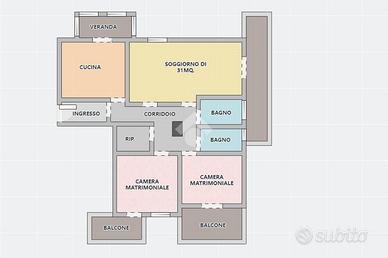 Dal corridoio, invece, si ha accesso alle due camere matrimoniali, entrambe con accesso al proprio balcone di pertinenza ed al bagno principale con vasca.