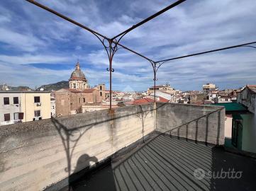 L'abitazione si apre su un ampio terrazzo al piano principale, un vero e proprio salotto all'aria aperta da cui lo sguardo abbraccia le cupole e i tetti antichi del centro storico.
