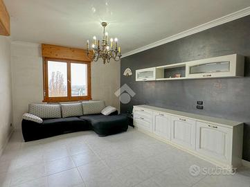 L'ingresso conduce direttamente alla zona giorno, composta da un ampio soggiorno che, grazie alla sua forma regolare, offre la possibilità di essere arredato e organizzato con cura. Da qui si accede anche alla comoda loggia, dove si può godere di momenti di relax o pranzi all'aperto.
