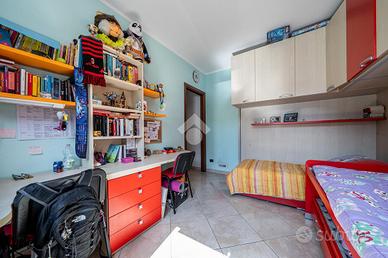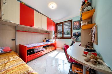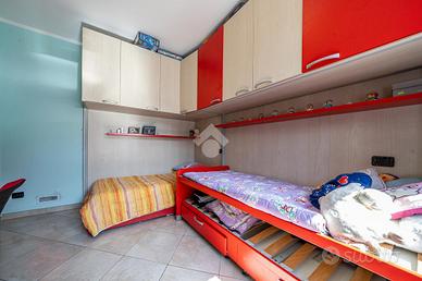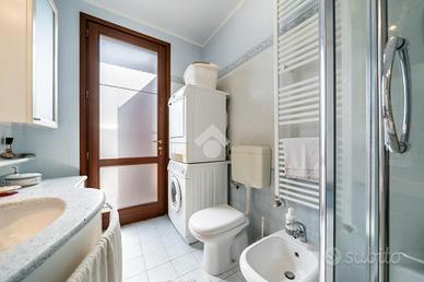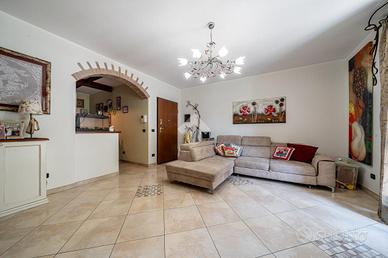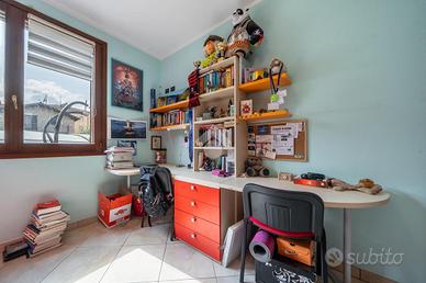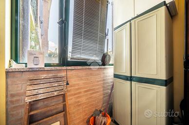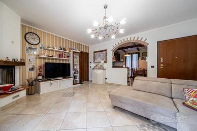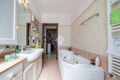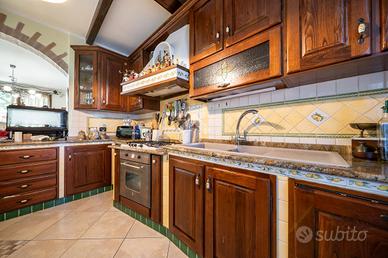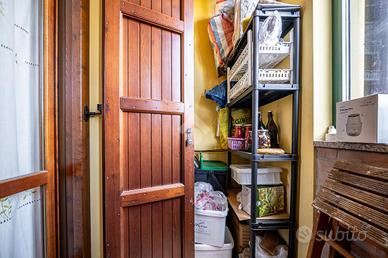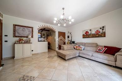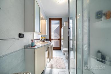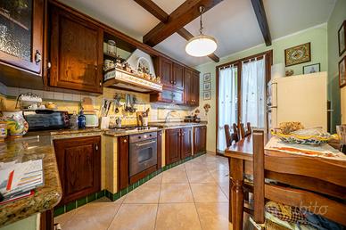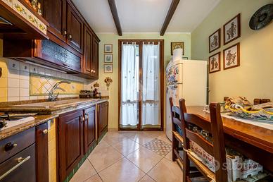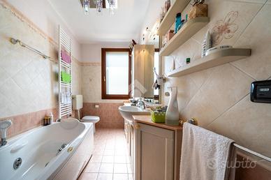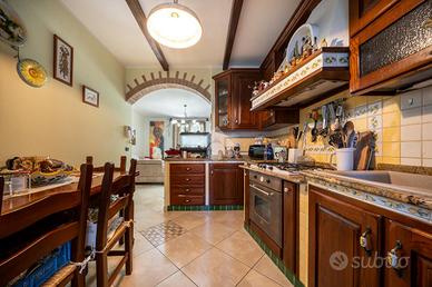 L'ingresso, apre direttamente sull'ampio e luminoso soggiorno con camino dove c'è una porta che conduce al ripostiglio e cucina abitabile entrambe dotate di portafinestra . Proseguendo dal disimpegno che ci conduce nella zona notte, troviamo due bagni,uno dotato di box doccia e l'altro con la vasca ed infine le due camera da letto.