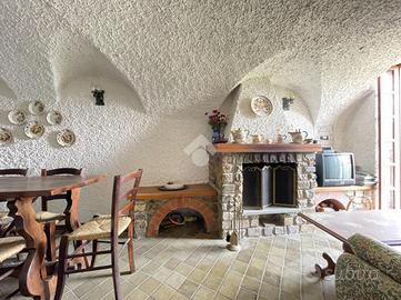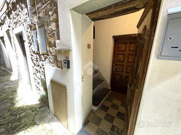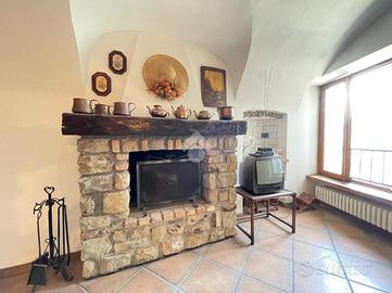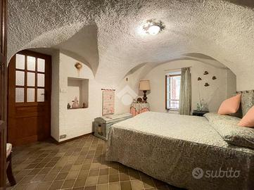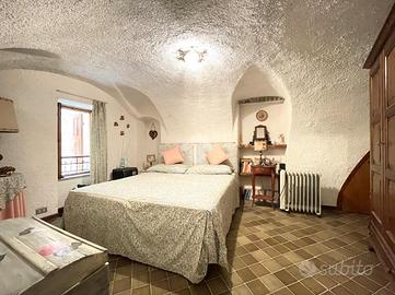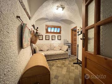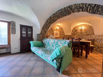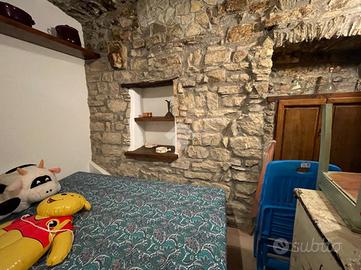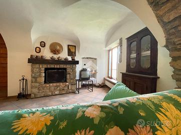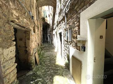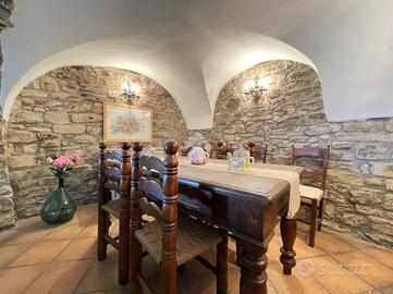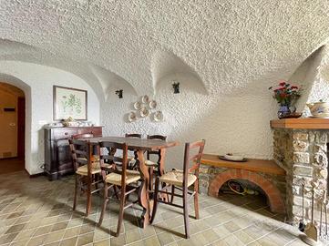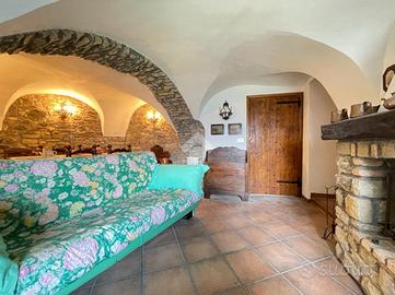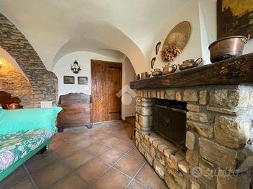 La proprietà è situato nella parte esterna del borgo di Perinaldo, nei pressi della Piazza della chiesa. Gli elementi caratterizzanti sono i soffitti a volta e la pietra a vista, dettagli architettonici originali che creano un'atmosfera rustica ed autentica, ricca di charme. L'appartamento è al primo piano e ha ampi spazi. L'ingresso è in un disimpegno da cui si accede al salotto con zona pranzo caratterizzato da un camino in pietra che rende l'ambiente ancora più accogliente. Adiacente, c'è la cucina abitabile, dove si può tranquillamente mangiare. Tramite un ampio disimpegno, si passa ad un secondo soggiorno, anch'esso con camino, diviso dalla zona pranzo da un suggestivo arco in pietra a vista. Attualmente l'organizzazione degli ambienti prevede solo una camera da letto, matrimoniale. Ma vista la presenza di un doppio soggiorno, si può facilmente realizzare una seconda camera di generose dimensioni. Il bagno ha la vasca. L'affaccio esterno al paese offre una vista aperta sul verde delle colline circostanti. A completare la proprietà, uno spazioso vano al piano terra che può essere utilizzato come stanza per gli ospiti.