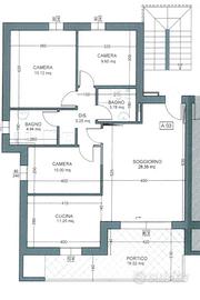 L'appartamento sorge al primo piano in un contesto di quadrifamiliare e si compone di un soggiorno, una cucina abitabile, una camera matrimoniale, due camere singole, un bagno finestrato, un bagno cieco e un terrazzo. Comprensivo di un box auto doppio in lunghezza e una cantina.
