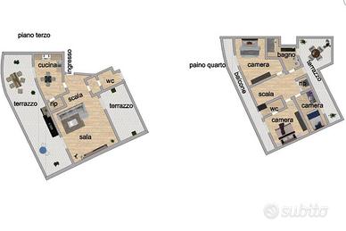 A seguire una funzionale scala in legno ci conduce alla zona notte al piano superiore, completa di una camera da letto padronale con bagno privato finestrato, una seconda camera da letto matrimoniale e ntrambe con affaccio sul balcone,una cemeretta con affaccio sul terrazzo, un ampio bagno completo di vasca e finestra e un rispostiglio adibito ad area lavanderia.