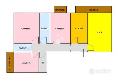 L'ingresso conduce a una spaziosa zona giorno collegata alla cucina abitabile. Un corridoio separa la zona giorno dalla zona notte, composta da due camere matrimoniali, una cameretta/studio, due bagni e un ripostiglio. L'immobile dispone di tre balconi, ben distribuiti tra zona giorno e camere, con buona esposizione e luminosità.