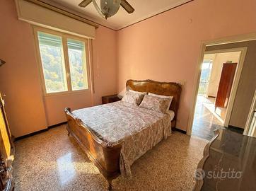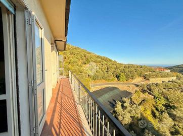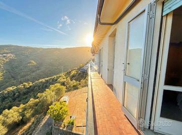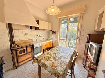 L'abitazione si apre su un corridoio di ingresso che conduce alla cucina, dotata di balcone con affaccio sul borgo, e al soggiorno, da cui si accede al secondo balcone della proprietà, ideale per godere di una piacevole vista sulla vallata.