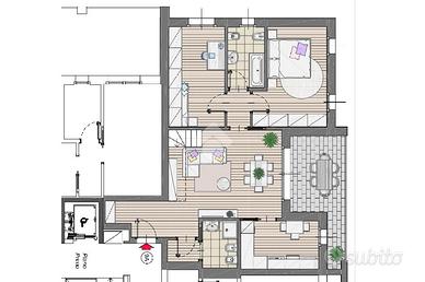 ingresso in disimpegno,soggiorno e cucina abitabile con terrazzo loggiato , camera matrimoniale, cameretta, bagno con antibagno lavanderia, e secondo bagno;