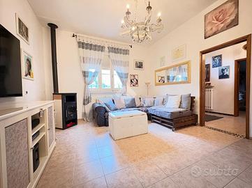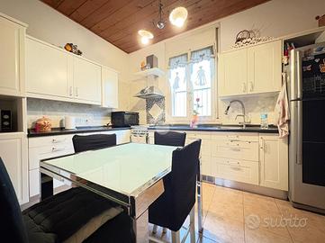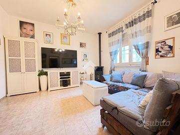 Appena entrati, un piccolo corridoio distribuisce gli ambienti del piano terra. A destra si accede alla cucina abitabile con zona pranzo, attualmente utilizzata come soggiorno. Sulla sinistra il salotto con camino funzionante,questa disposizione rende gli ambienti ben vivibili e accoglienti.