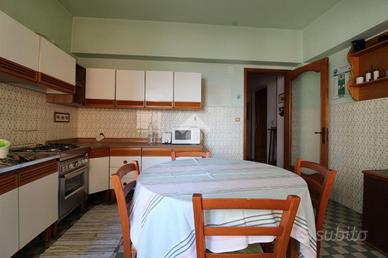 La casa dispone di doppi servizi, due comode cantine di pertinenza e un pratico ripostiglio in cucina, ideale per ottimizzare gli spazi.