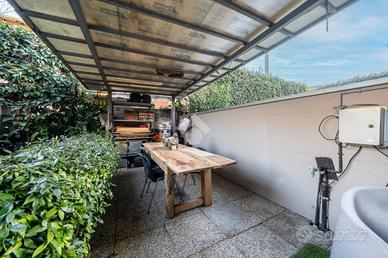 Al piano terra è presente un ampio soggiorno con cucina separata, che si affaccia sul portico e sul giardino privato, e un bagno adibito a lavanderia.