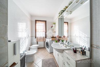 Sempre al piano terra, di pertinenza dell'immobile, troviamo un garage doppio in larghezza con due basculanti e un posto auto all'interno del cortile condominiale.