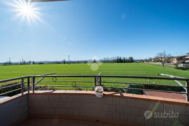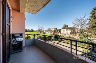 Tramite una scala esterna privata si accede all'appartamento principale, posto al primo piano. Entrando troviamo un ampio e luminoso soggiorno con cucina a vista, dotato di terrazzino che affaccia sul giardino privato, creando una piacevole continuità tra interno ed esterno. Un disimpegno, caratterizzato da una porta a libro, separa con eleganza la zona giorno dalla zona notte, composta da due camere matrimoniali, entrambe con un balcone a servizio, e da un bagno.