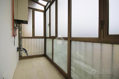 La distribuzione degli spazi è funzionale e ben organizzata. L'immobile gode di una tripla esposizione nord, est e ovest, che assicura una buona luminosità durante l'arco della giornata. Il soggiorno, esposto a ovest, dispone di accesso diretto alla terrazza, ideale come spazio esterno vivibile; la cucina, orientata a est, è collegata direttamente alla veranda. Un disimpegno centrale separa la zona giorno dalla zona notte, composta da tre ampie camere matrimoniali e da un bagno finestrato con doccia.