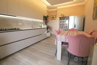 L'appartamento si sviluppa su una superficie di 145 mq, che lo rende perfetto per chi desidera godere di ampi spazi interni. L'ingresso conduce immediatamente alla zona giorno, composta da un soggiorno molto ampio, ideale per accogliere momenti di convivialità con familiari e amici, dotato di porta finestra con uscita sul primo balcone.