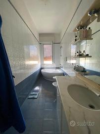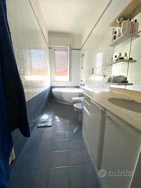 Il bagno principale dell'appartamento è dotato di una vasca angolare, un elemento di design lussuoso e confortevole, particolarmente apprezzato negli anni '90.