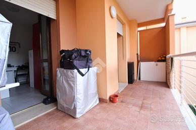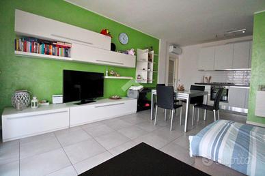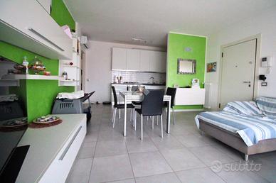 L'ingesso si apre sul comodo soggiorno con angolo cottura, dal quale si accede al primo balcone.
