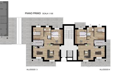Gli alloggi disponibili sono situati al primo e piano dotati di ascensore. Dall'ingresso si accede al luminoso soggiorno con cucina abitabile a vista dotato di sfogo sull'ampio terrazzo coperto. Il disimpegno conduce alle due camere da letto, una con sfogo sul balcone, al bagno finestrato e al ripostiglio.